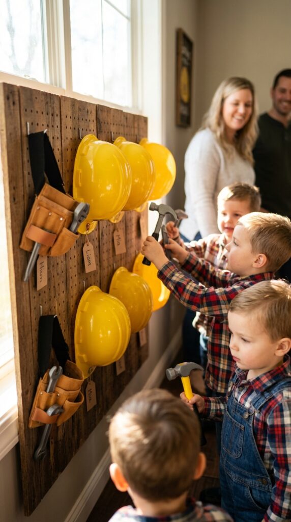 Mount pegboards at kid height and hang actual tool belts—you’ll find affordable sets at hardware stores for under $15. Create a hardhat display using sturdy wall hooks spaced 12 inches apart. I recommend adding name labels to each hard hat so kids feel like official crew members.
