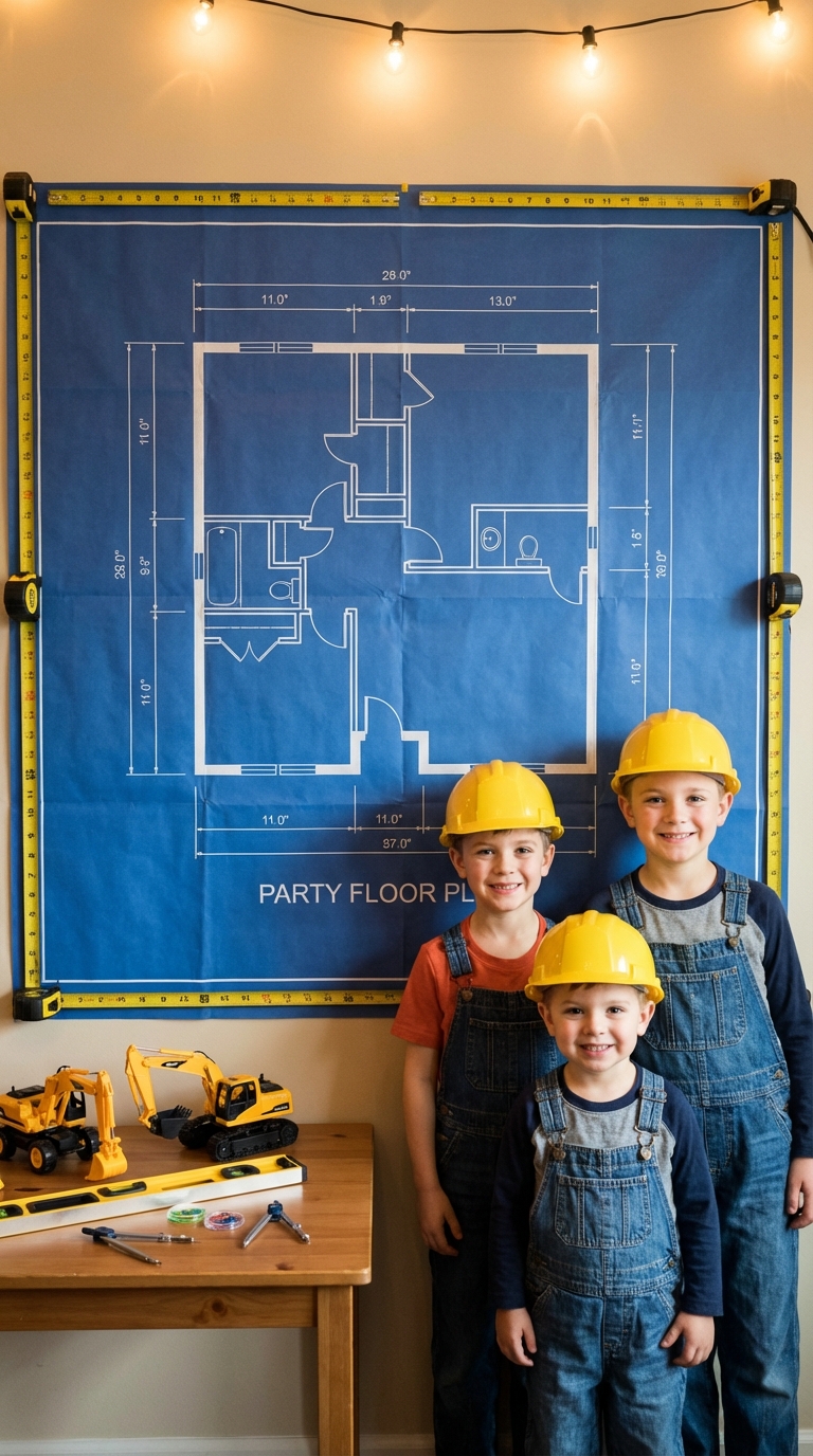 While tool belts give kids hands-on props to grab, blueprint backgrounds create that authentic construction office aesthetic that makes the whole party space feel like a real job site.