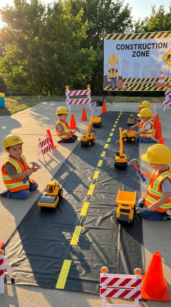 This incomplete construction scene works brilliantly because it’s instantly recognizable. Kids love posing between the cones like they’re directing traffic themselves. You can add caution tape draped loosely across the setup to enhance your unfinished work zone aesthetic.