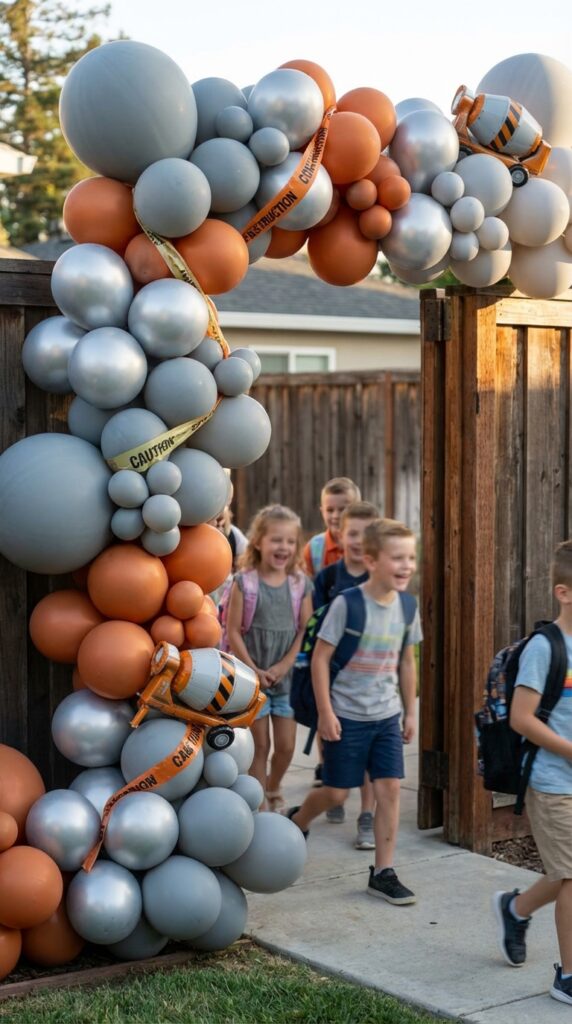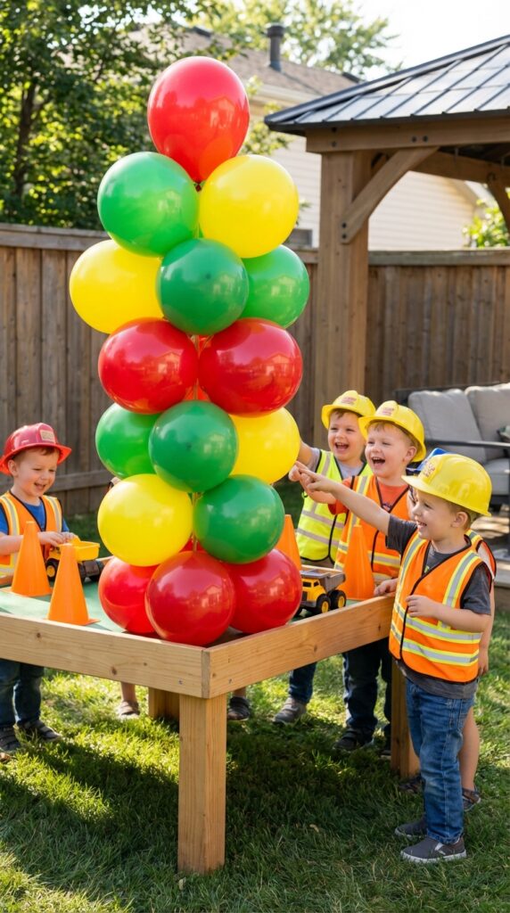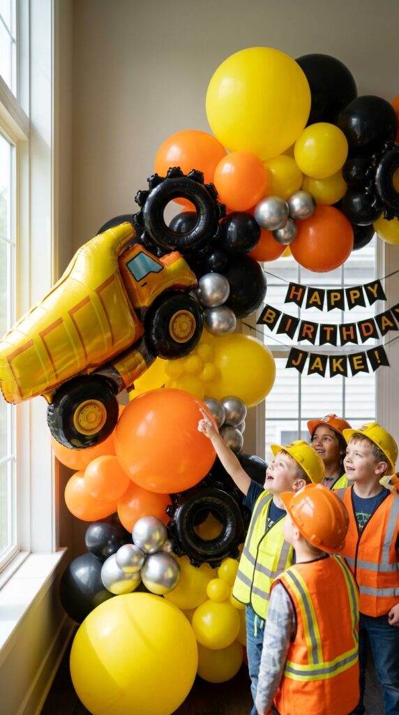 Trust me, kids’ faces light up when they spot this towering creation. For an even more cohesive construction theme, consider pairing your balloon entrance with construction-themed cake designs featuring matching dump truck and digger elements.