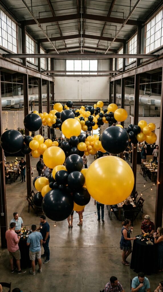 Because nothing alters an ordinary party space quite like dramatic overhead décor, black and yellow balloon ceiling clusters create that industrial warehouse atmosphere you’re aiming for. You’ll want to group five to seven balloons together, mixing matte black with glossy yellow for visual interest.