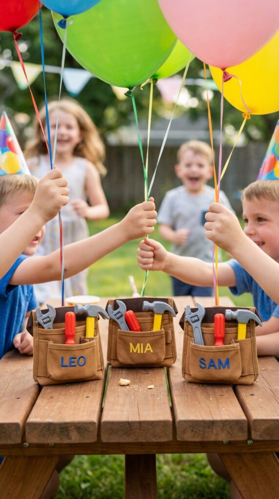 You’ll find customized tool balloon favors that clip onto each child’s balloon string while displaying their name. These personalized balloon tool belts come equipped with plastic tools like hammers, wrenches, and screwdrivers that kids absolutely love.