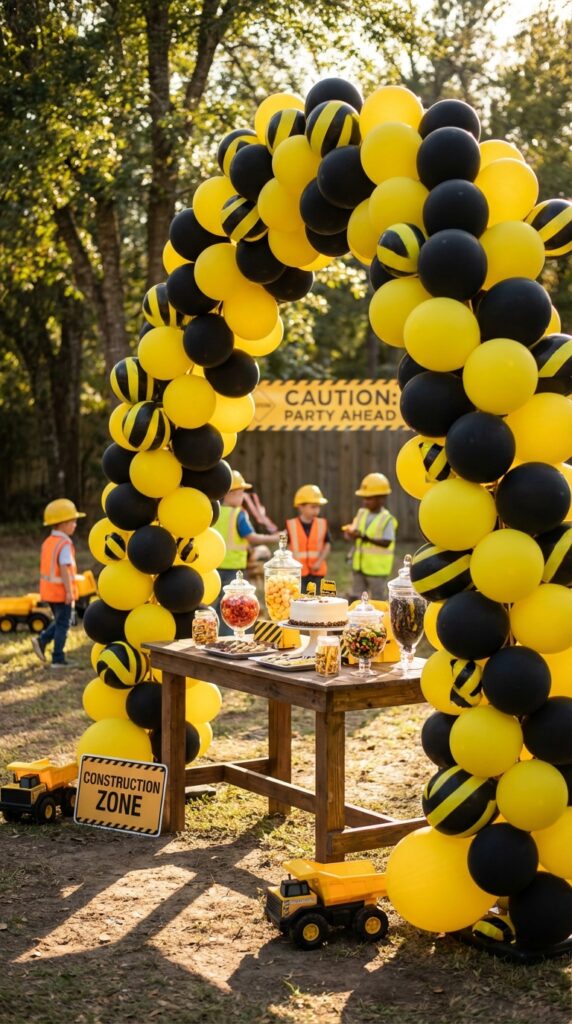 Position oversized caution sign balloons above your cake table and gift area—they’re impossible to miss. Add caution tape accents along table edges for that authentic construction vibe that ties everything together.