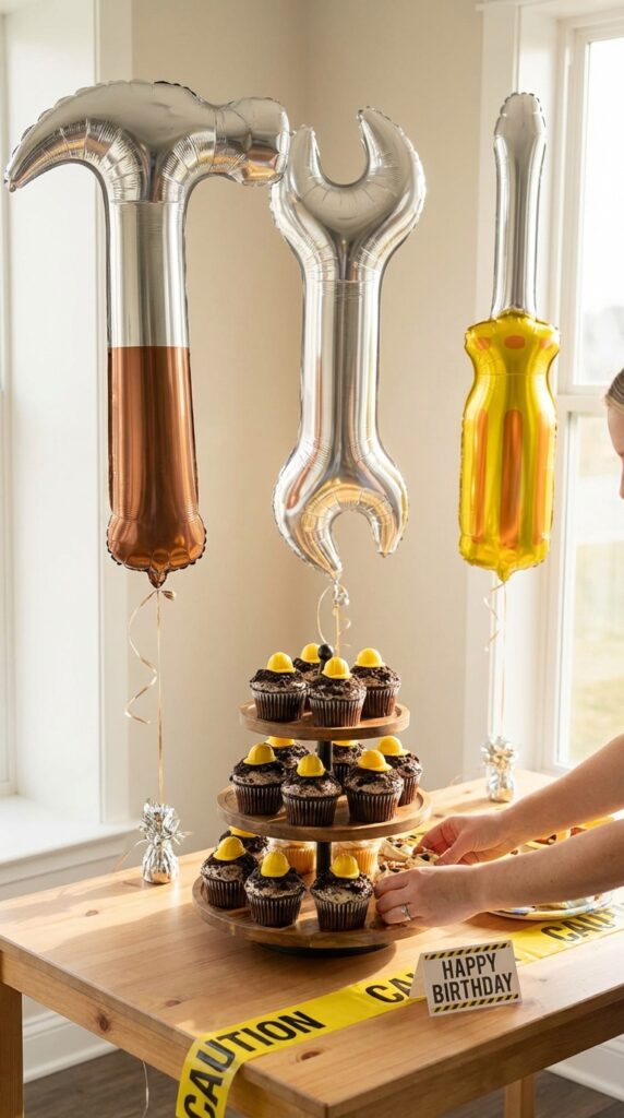 I love anchoring giant hammer, wrench, and screwdriver balloons behind tiered cupcake stands. The metallic finish catches light beautifully, creating photo-worthy moments parents actually want to capture.