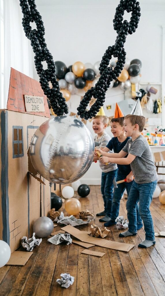 You’ll want to create modular wrecking ball displays using a large silver or gray balloon as the “ball” attached to black balloon chains. Position them near your designated photo area—kids absolutely love pretending to demolish things.