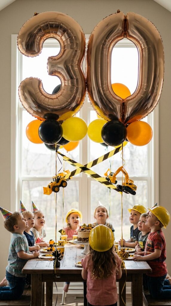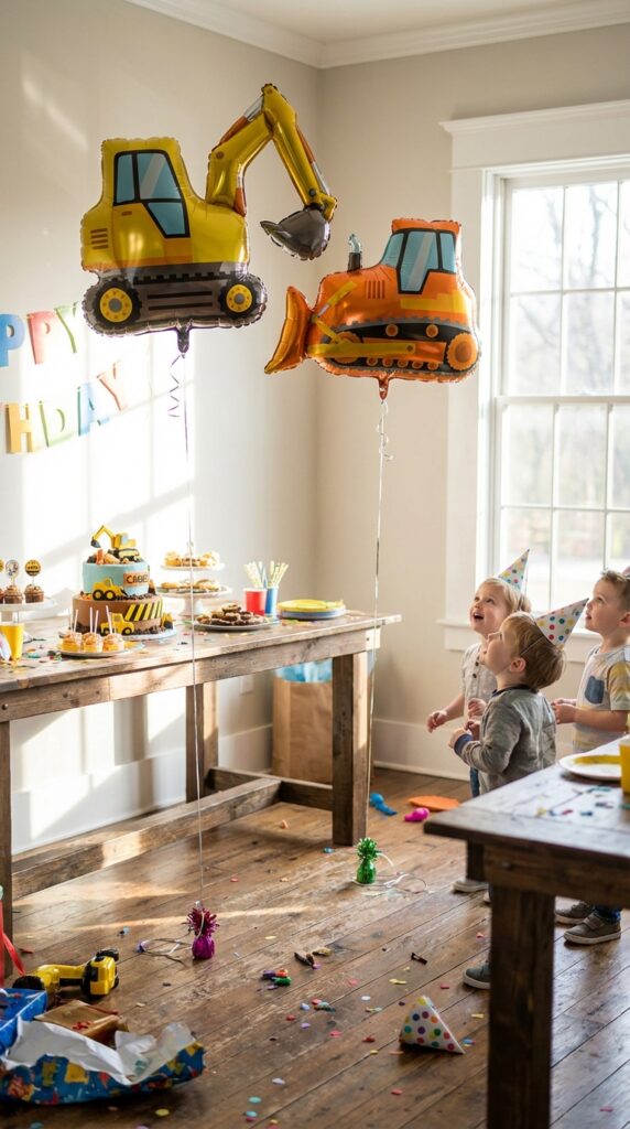 I’ve seen parents attach small plastic bulldozers directly to number balloons using clear fishing line—it creates an impressive floating effect. You can also cluster black and yellow latex balloons around your numbers to reinforce the construction zone aesthetic.