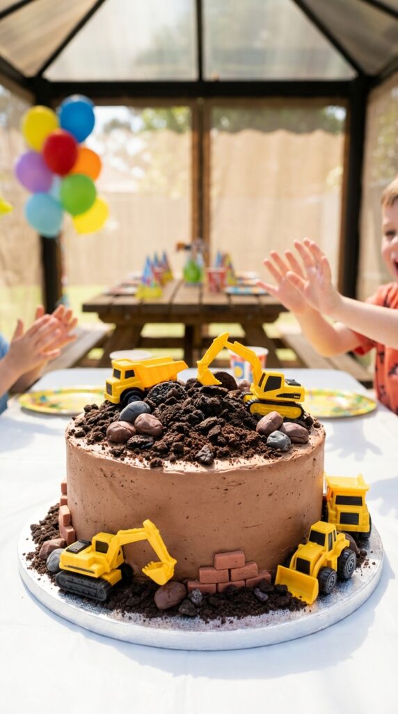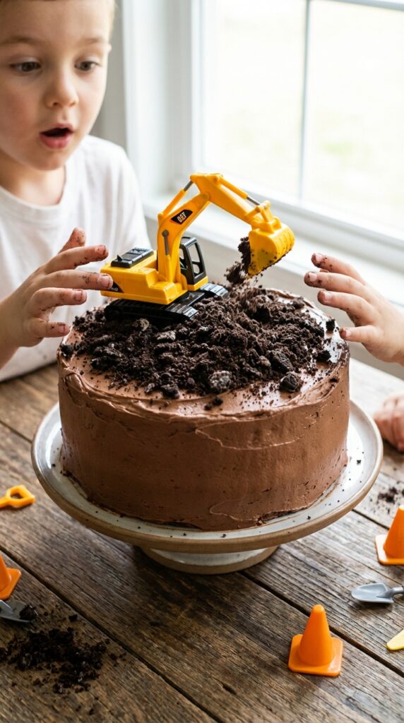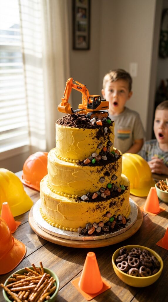 Here’s where excavator cake decorating techniques really shine: position a toy excavator mid-dig on the top tier, then cascade edible rocks and chocolate crumbles down each level. The vertical design creates visual drama that makes your child’s cake the party’s undisputed centerpiece.