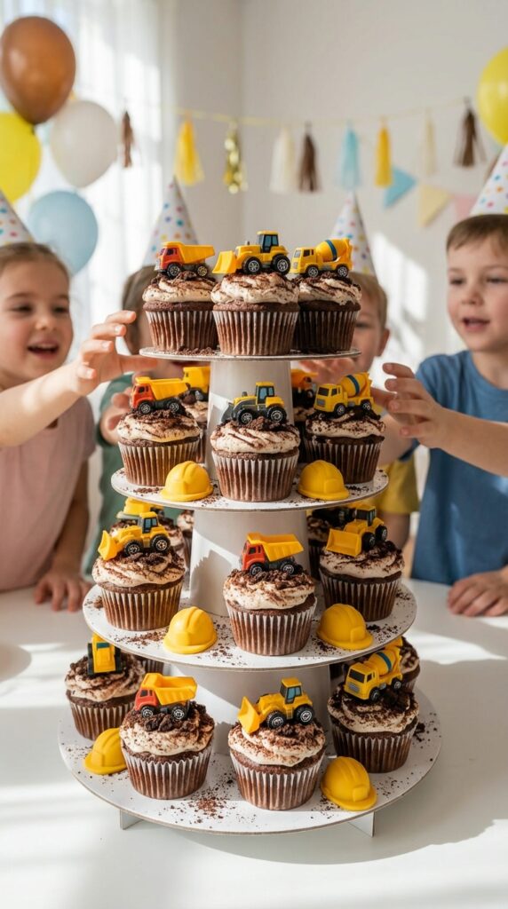When you’re feeding a crowd of construction-loving kids, cupcake towers offer the perfect solution—and they’re honestly easier to manage than slicing a massive cake while hyperactive five-year-old circle your legs.