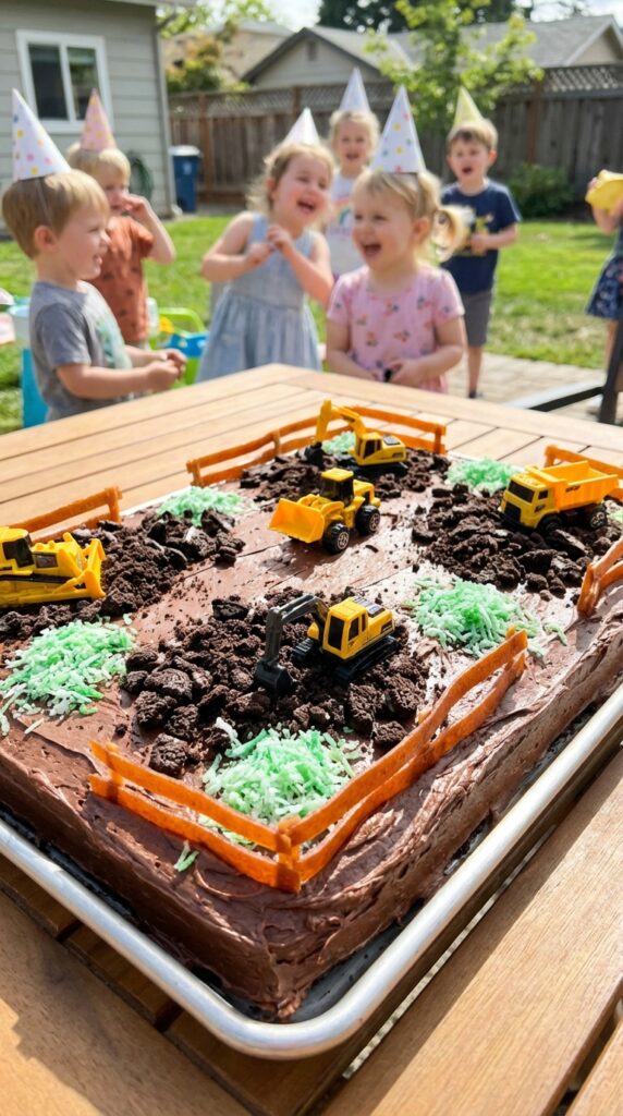 The classic construction site cake remains the most popular choice for good reason—it’s surprisingly simple to pull together, and kids absolutely lose their minds over the realistic edible dirt.