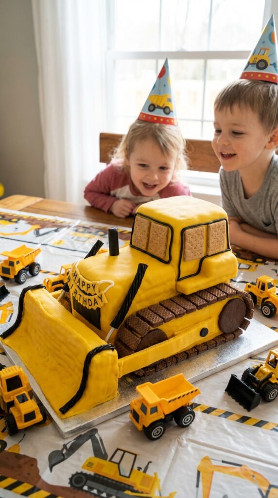 A three-dimensional bulldozer cake alters your construction party from ordinary to unforgettable—and it’s more achievable than you’d think. You’ll carve stacked sheet cakes into the bulldozer’s body and blade, then cover everything with yellow fondant or buttercream.