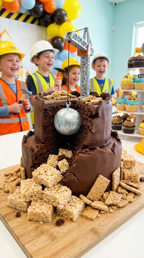 The key? Use Rice Krispies treats for realistic rubble effects and dust the scene with graham cracker “debris” for authentic construction site vibes. These age-appropriate construction cake designs ensure that even the youngest party guests can safely enjoy the demolition theme without any overwhelming elements.