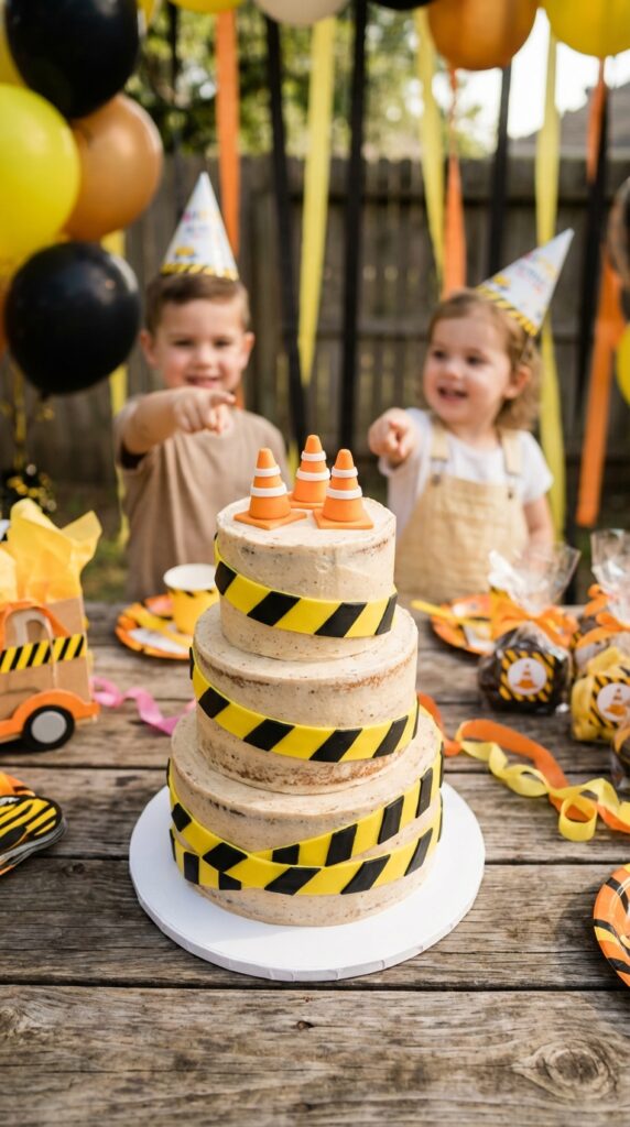 Every construction party needs bold safety features, and nothing screams “construction zone” quite like lively orange traffic cones paired with that iconic yellow-and-black caution tape.