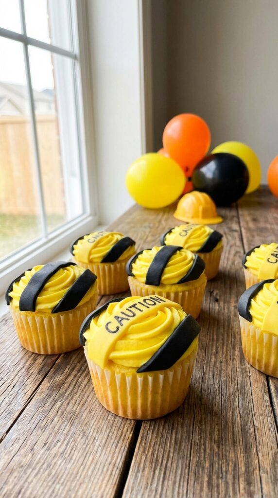Those dump trucks are fantastic, but sometimes you want a cupcake design that’s a bit more streamlined—and that’s where caution tape cupcakes come in. You’ll create diagonal yellow and black stripes across the frosting using fondant strips or piped buttercream. The crisscrossed caution tape pattern instantly screams “construction zone” without requiring elaborate decorating skills.