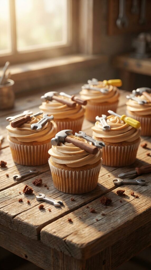 While vehicle-themed cupcakes get the vehicles rolling, tool belt cupcakes let you showcase the actual equipment that makes construction sites run. You’ll frost each cupcake in brown or tan to mimic leather, then create fondant tool decorations like hammers, wrenches, and screwdrivers. I’ve found that simple cupcake tool design works best—stick with basic shapes that kids recognize instantly.