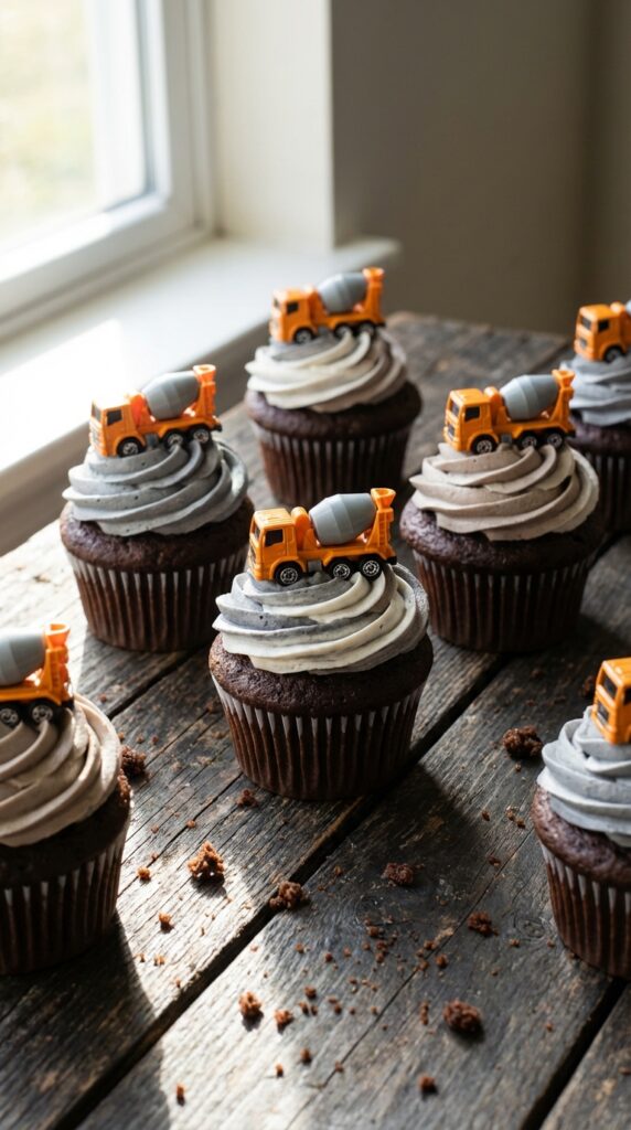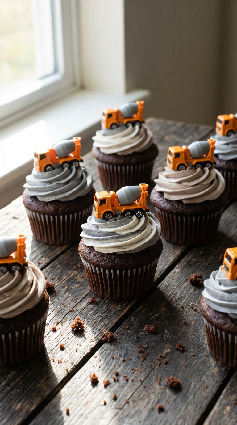 Concrete mixer cupcakes bring the spinning action of construction sites right to your dessert table. You’ll create these showstoppers using textured frosting techniques that mimic real concrete—think gray buttercream swirled with brown and white to replicate that tumbling mixture.
