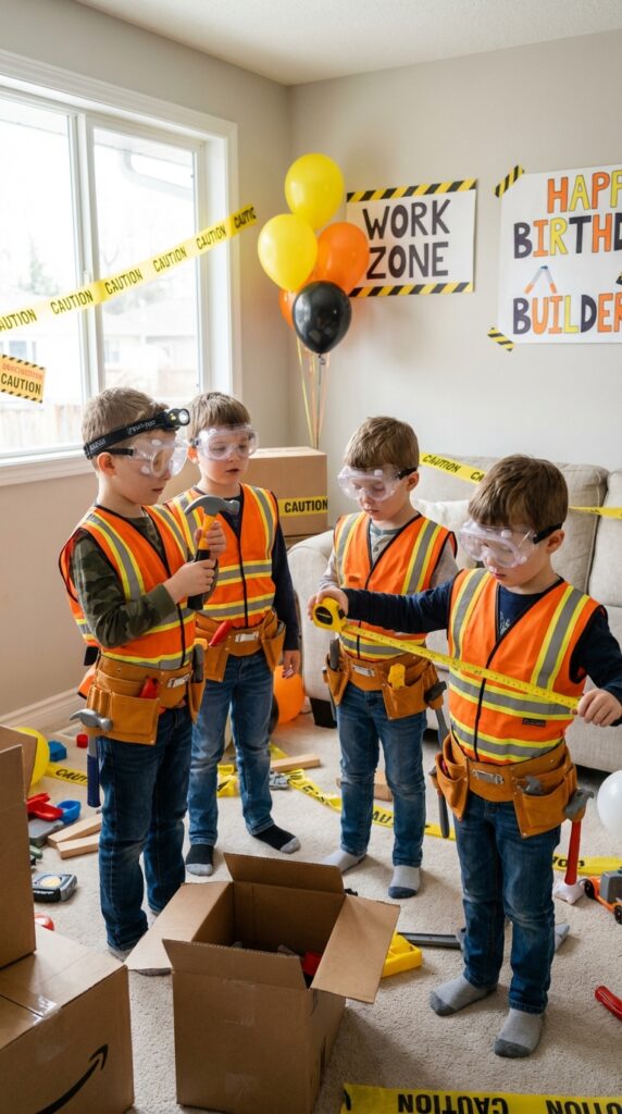 Don’t forget safety goggles and personalized work gloves with each child’s name. Orange construction vests complete the look perfectly, doubling as instant photo ops.