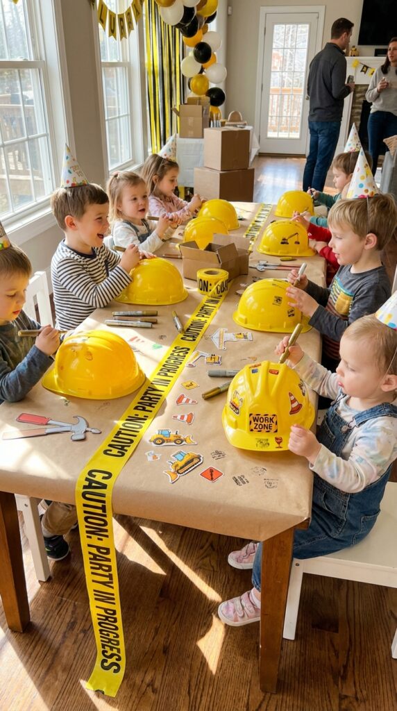 Setting up a hard hat decorating station converts party favors into personalized keepsakes that kids will actually wear long after the bulldozer cake is gone.