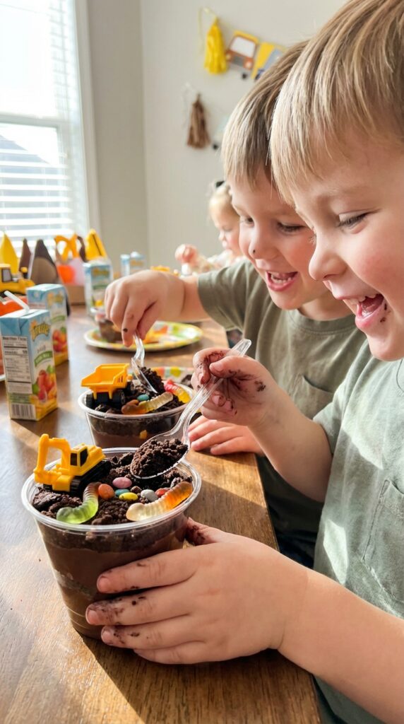 These construction themed desserts double as edible decorations and interactive activities. Kids love getting their hands dirty (pun intended) while creating their treats. Set up a dirt cup station with all the toppings, and watch them become little dessert designers. For an extra special touch, consider adding cupcake designs with construction signs and gravel toppings alongside your dirt cup station. It’s messy, delicious fun that keeps everyone entertained.