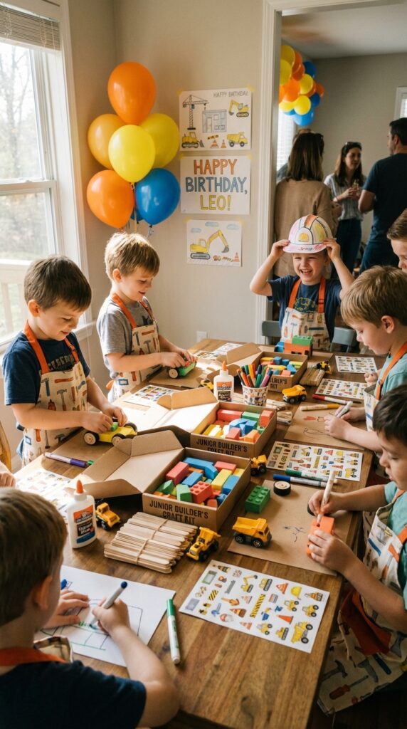 These craft activities work especially well for toddlers and young children who need age-appropriate construction party entertainment that matches their developmental abilities.