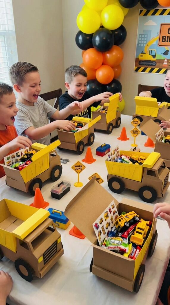 You can find personalized construction cones online or create your own using orange cardstock rolled into cone shapes. Fill them with candy, small toys, or construction-themed goodies like chocolate rocks and gummy worms.