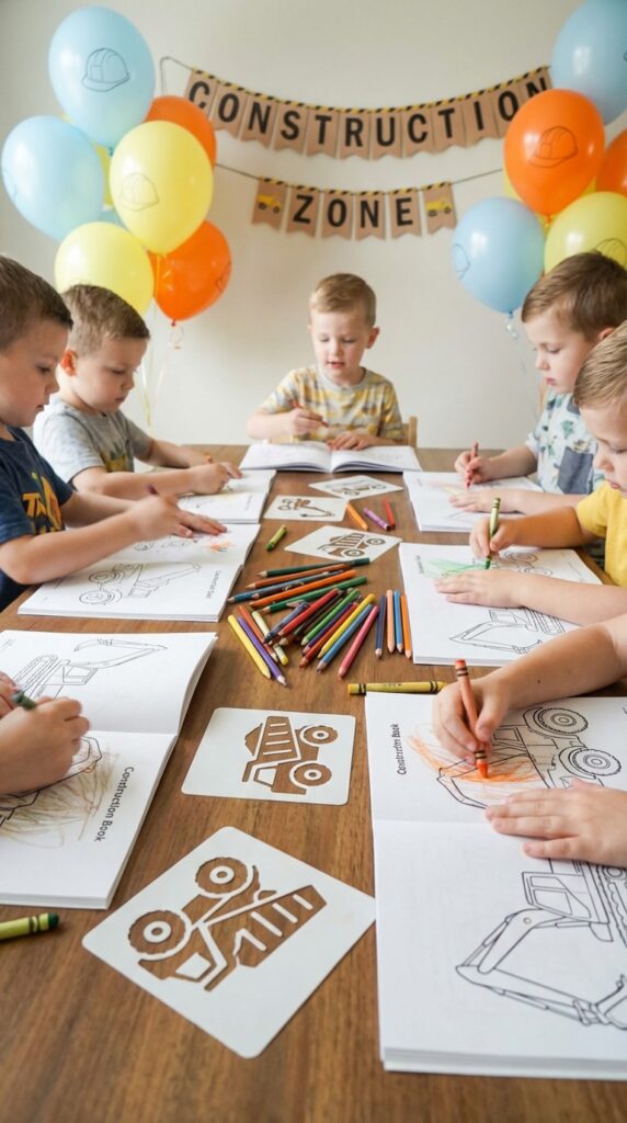 Construction-themed coloring books pair perfectly with crayons tucked inside your favor bags. You’ll find options featuring dump trucks, excavators, and hard-hatted workers that’ll keep kids busy during cake time.