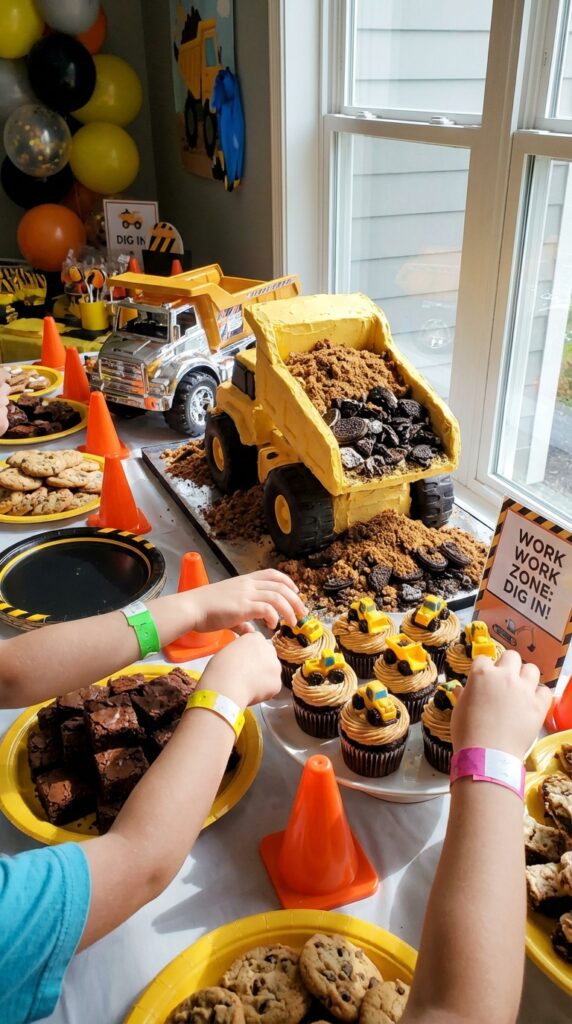 When it comes to centerpiece desserts, a dump truck cake metamorphoses your party table into a construction site that’ll have kids rushing over with wide eyes. You can bake a 3D truck-shaped cake or arrange a cupcake dump truck display where frosted treats fill the bed of a toy vehicle.