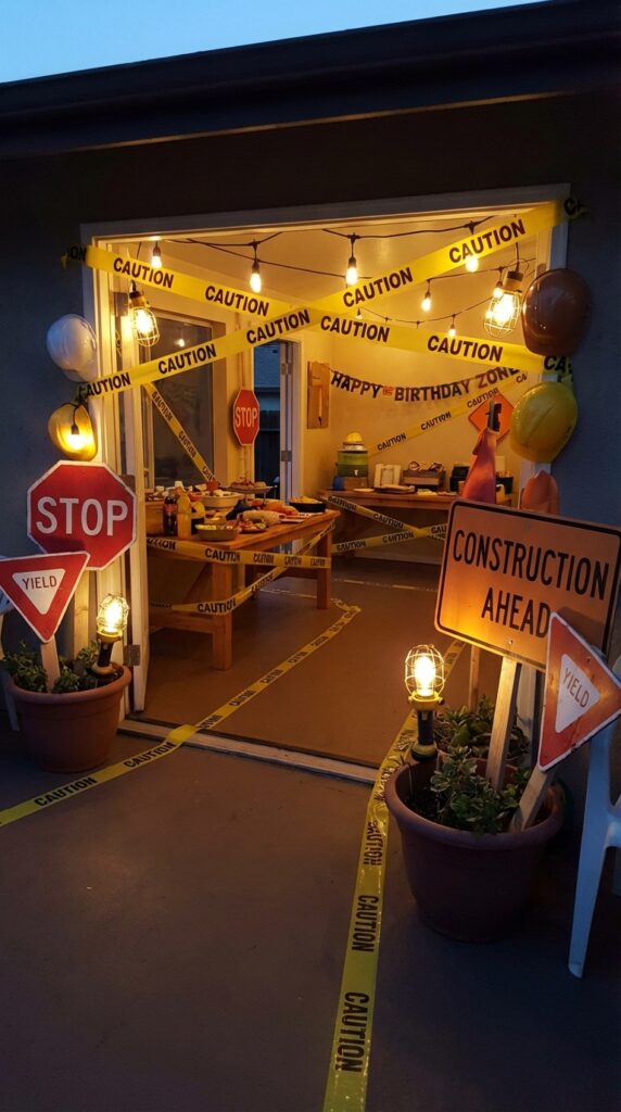 Grab foam or cardboard traffic signs from party stores—stop signs, yield signs, construction ahead warnings. Mount them on walls or stake them in your yard. Add construction themed lighting with orange string lights or battery-powered work lamps. Create a safety equipment display featuring mini hard hats, vests, and toy tools near your entrance.