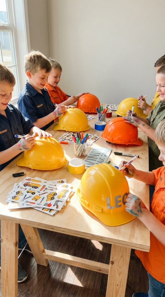 Every construction worker needs proper safety gear, and your party guests are no exception. Set up a dedicated station where kids can customize their own hard hats as they arrive. Stock it with plain yellow or orange plastic hats, then lay out stickers, markers, and vinyl letters for personalization.