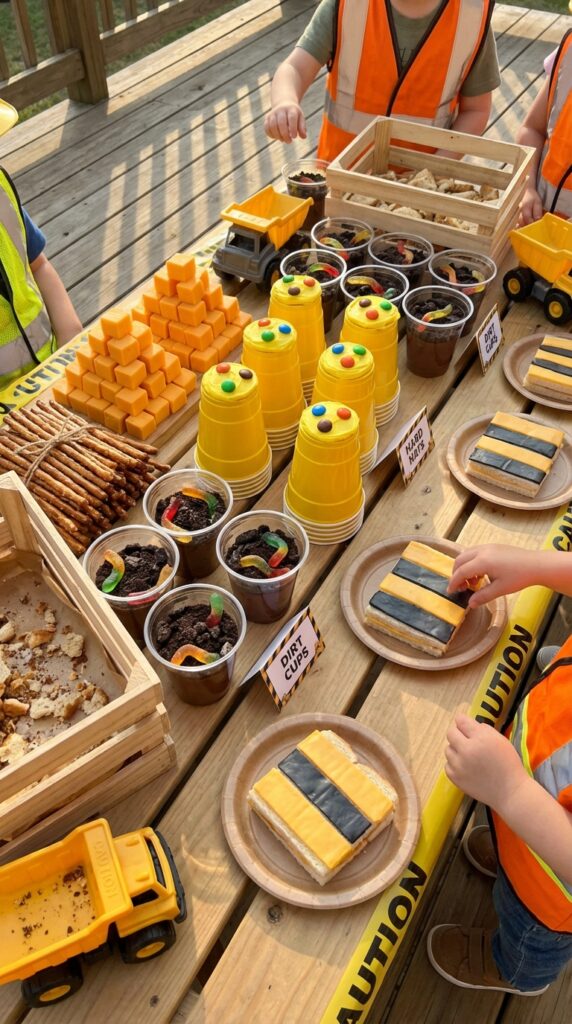 After all that hard work decorating hats and playing games, your little construction crew will be ready to refuel. I love setting up themed snack plates that look like mini construction sites—think orange cheese cubes as traffic cones and pretzel sticks as lumber.