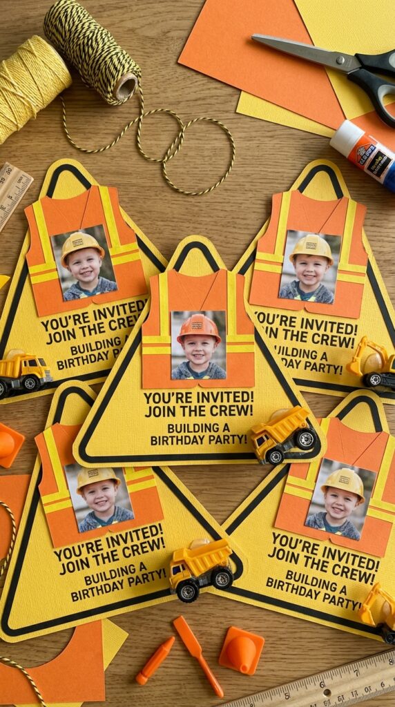 Use black and yellow stripes as borders, attach miniature toy trucks with glue dots, or stamp “UNDER CONSTRUCTION” across the top. These handmade touches make guests feel special from the start. Consider creating printable signage elements right on your invitations to give guests a preview of the construction zone experience they’ll encounter at the party.