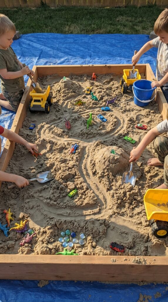 Fill a large sandbox or kiddie pool with kinetic sand, then hide small toys, plastic gems, or “fossils” for unearthing missions. Provide real toy excavators, dump trucks, and shovels—the metal ones work better than plastic (trust me on this).