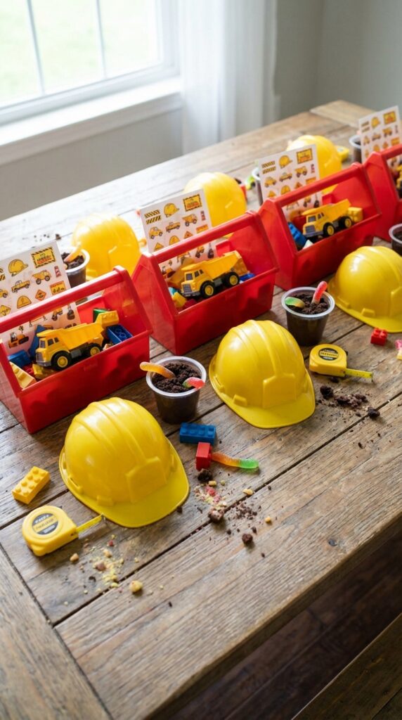 Fill small toolboxes or hard hats with construction themed favors like toy dump trucks, building block sets, and chocolate “dirt” cups. You can find affordable party favor supplies at dollar stores or online in bulk.