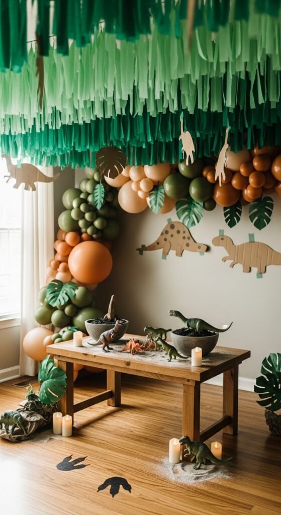 Traversing your living space into a Jurassic expedition doesn’t require a Hollywood budget—just some creativity and a few trips to the craft store. Start with dinosaur themed backdrops using green streamers and cardboard cutouts of prehistoric plants. I’ve found that layering different shades creates depth that’ll wow your little paleontologist.
