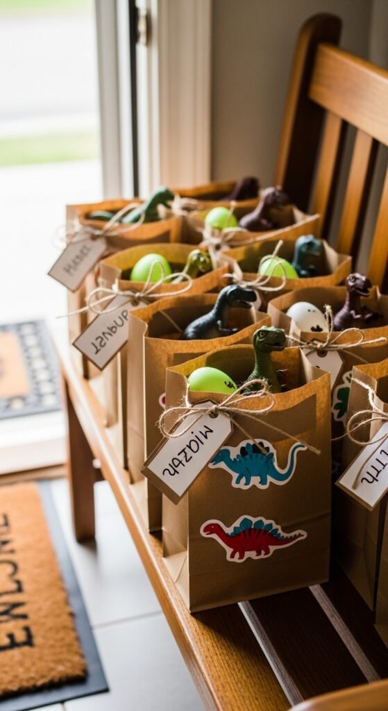 You’ll want sturdy brown paper bags decorated with colorful dinosaur stickers—they’re mess-friendly and budget-conscious. Add personalized party tags featuring each child’s name alongside their favorite dino species.