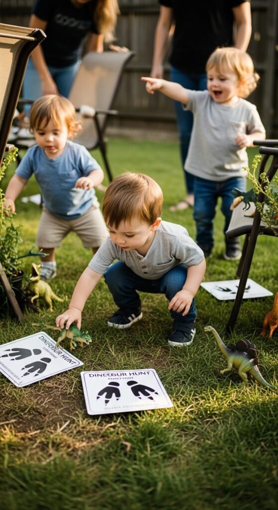 A dino themed scavenger hunt works perfectly for 3-year-olds. Hide plastic dinosaurs around your party space with simple image clues—think footprint trails leading to discoveries. Keep the search area contained and clues visual rather than text-based.