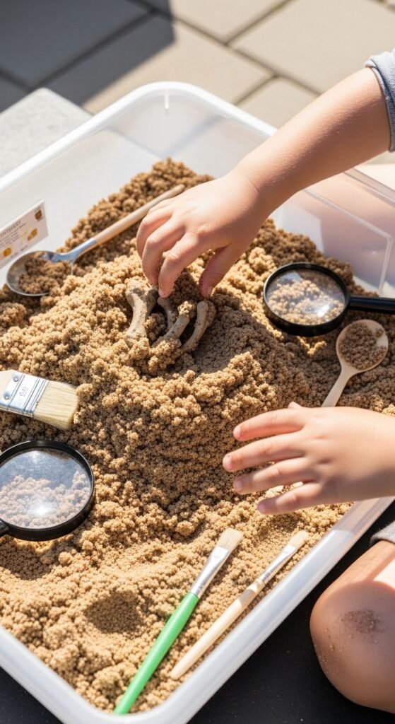Set up excavation dig challenges using sandbox sand mixed with buried “fossils” (plastic bones or toy dinosaurs). Give each child a small brush and spoon for digging. Trust me, they’ll spend ages uncovering treasures while feeling like real paleontologists on an expedition.