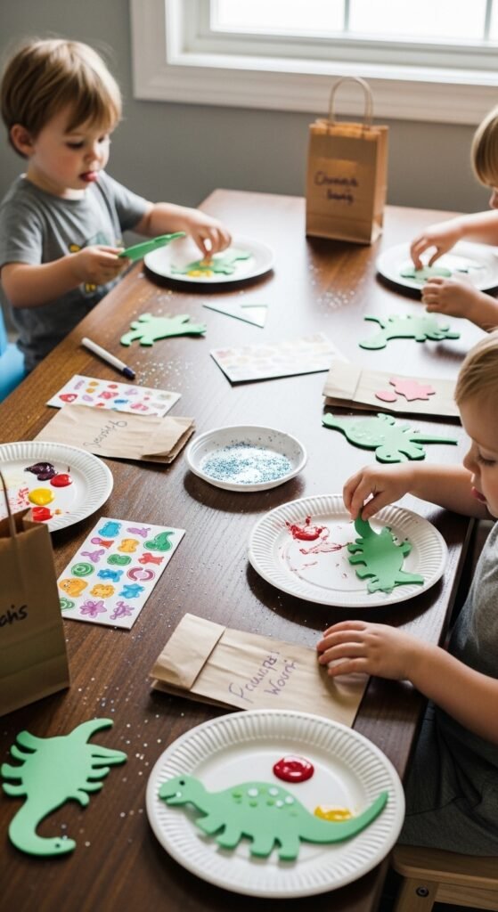 Consider paper plate triceratops masks or simple dinosaur handprint art using washable paint. Each child’s creation becomes unique personalized take home favors that parents actually appreciate—no more plastic trinkets heading straight to the trash!