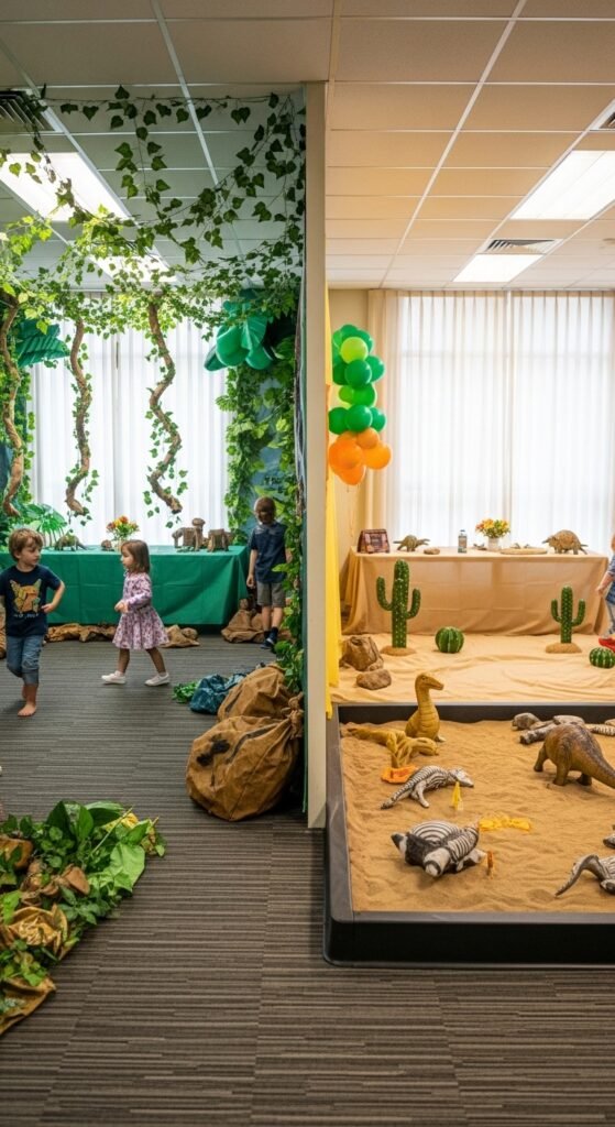 Start by sectioning your space into distinct habitats. Rework one corner into a lush Jurassic forest using realistic foliage displays—think oversized ferns and hanging vines from your local craft store. Construct a desert landscape in another area with sand-colored tablecloths and cacti.