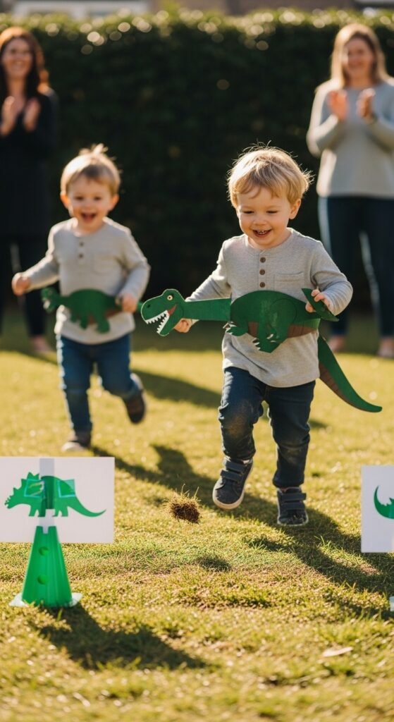 Start with dinosaur chase games where one child becomes the “T-Rex” and chases others who must freeze when tagged. Then organize roaring dinosaur relays—divide kids into teams and have them crawl like velociraptors, stomp like triceratops, or fly like pterodactyls between stations.