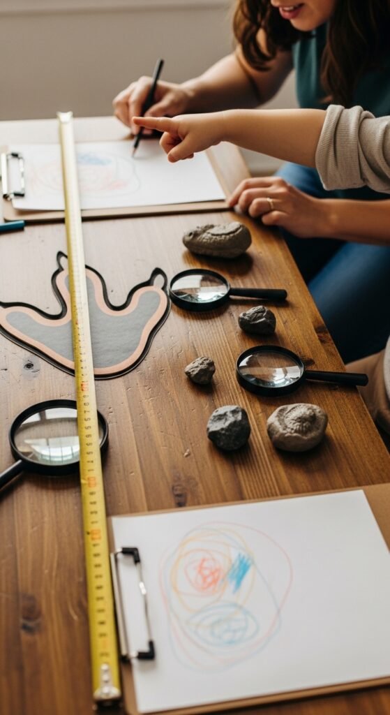 Set up a fossil excavation sandbox using kinetic sand and buried toy dinosaur bones. Kids love digging for treasures! Create a dinosaur size comparison station with measuring tape and life-size footprint cutouts.