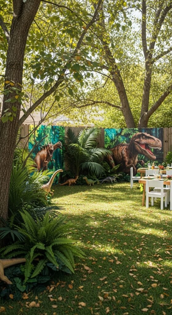 The magic starts the moment your guests step into your backyard – and trust me, altering your space into a prehistoric wonderland is easier than you might think. Start with realistic dinosaur backdrops hung on fences or trees. You can find affordable vinyl ones online that’ll instantly transport everyone back 65 million years.