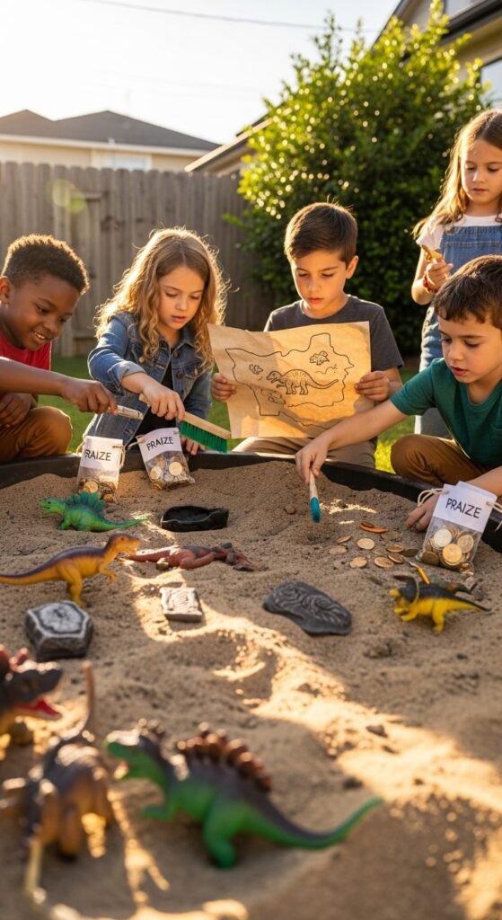 Set up themed fossil excavations using sandbox sand and buried plastic dinosaurs. I’ve found that hiding small toys in different zones keeps everyone engaged. Create treasure maps with simple drawings leading to “fossil sites.”
