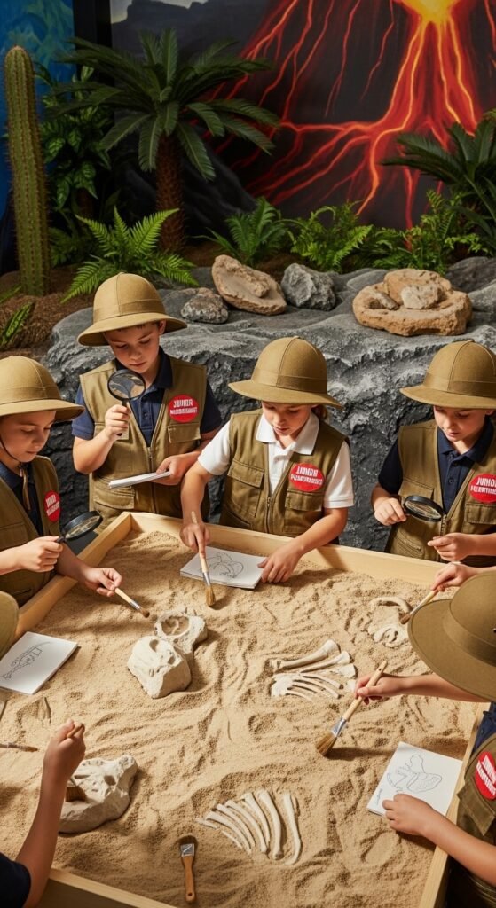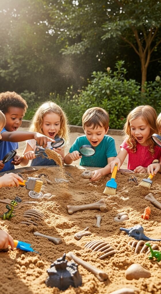 Set up fossil excavation stations using sandbox sand and buried “dinosaur bones” (dog treats work perfectly). Give each child a small brush and magnifying glass—they’ll feel like real archaeologists uncovering ancient treasures.