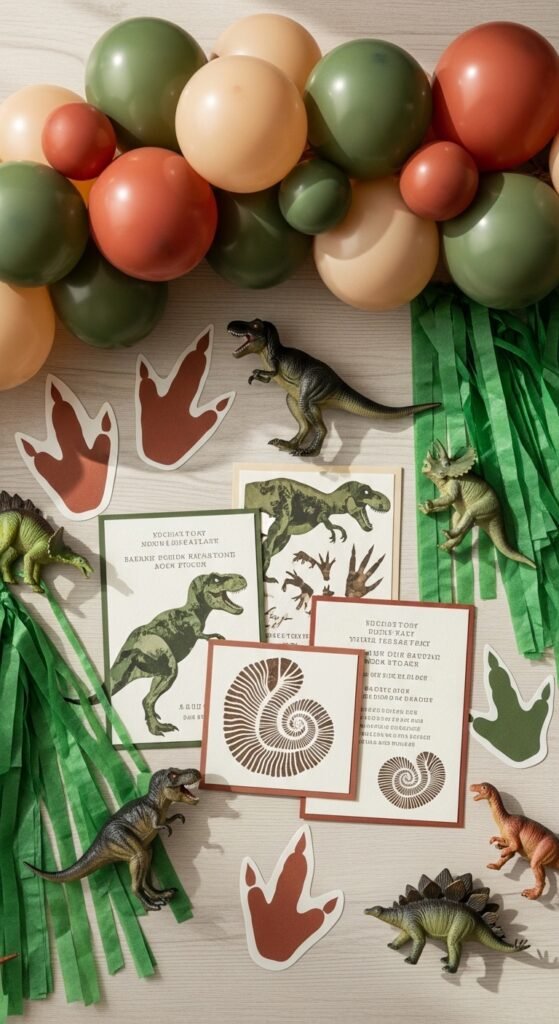 Before guests even arrive at your dinosaur celebration, you’ll want to build excitement with invitations that transport them back 65 million years. Choose dinosaur themed stationery featuring T-Rex silhouettes or fossil prints—I’ve found that kids start getting excited the moment they see that prehistoric imagery.