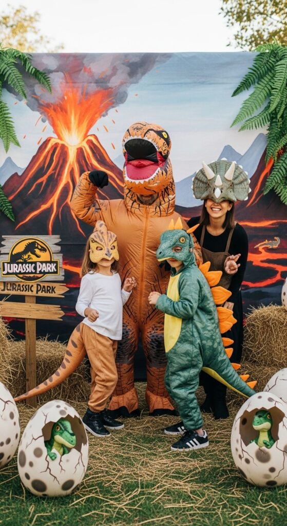 Create dinosaur photo booth props using cardboard—think giant dinosaur eggs, volcanic backdrops, and “Welcome to Jurassic Park” signs.