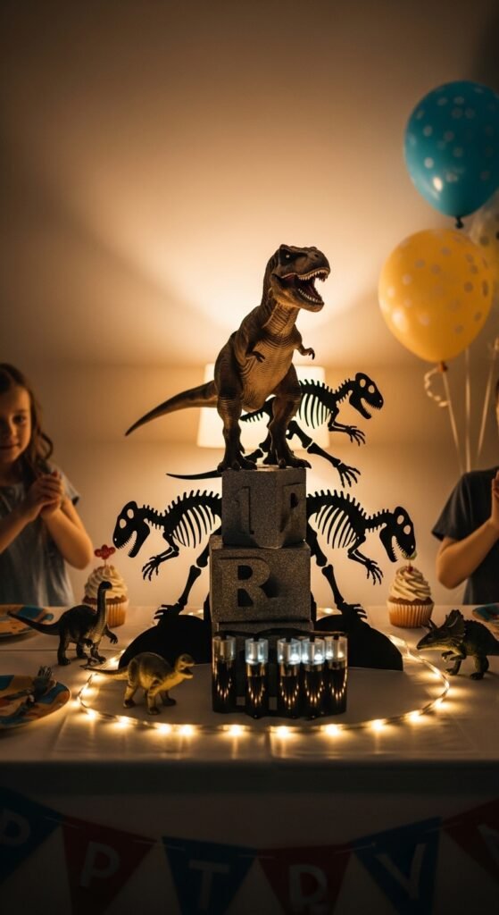 Pro tip: Use battery-operated LED strips underneath for subtle backlighting. The glow makes everything pop, especially during evening celebrations. Your guests won’t just see centerpieces; they’ll witness entire prehistoric worlds.