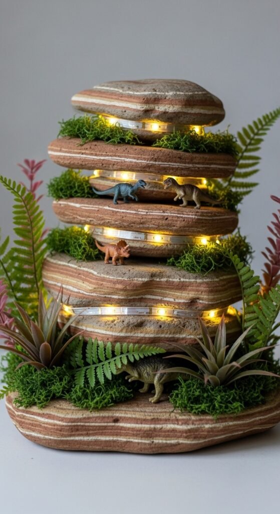 You’ll want to stack different-sized rocks or foam blocks to create layered rocky outcrops with fossils. I recommend hiding small plastic dinosaurs between the layers—kids love unearthing them during dinner! Add artificial prehistoric plant specimens like ferns and cycads around the base for authenticity.