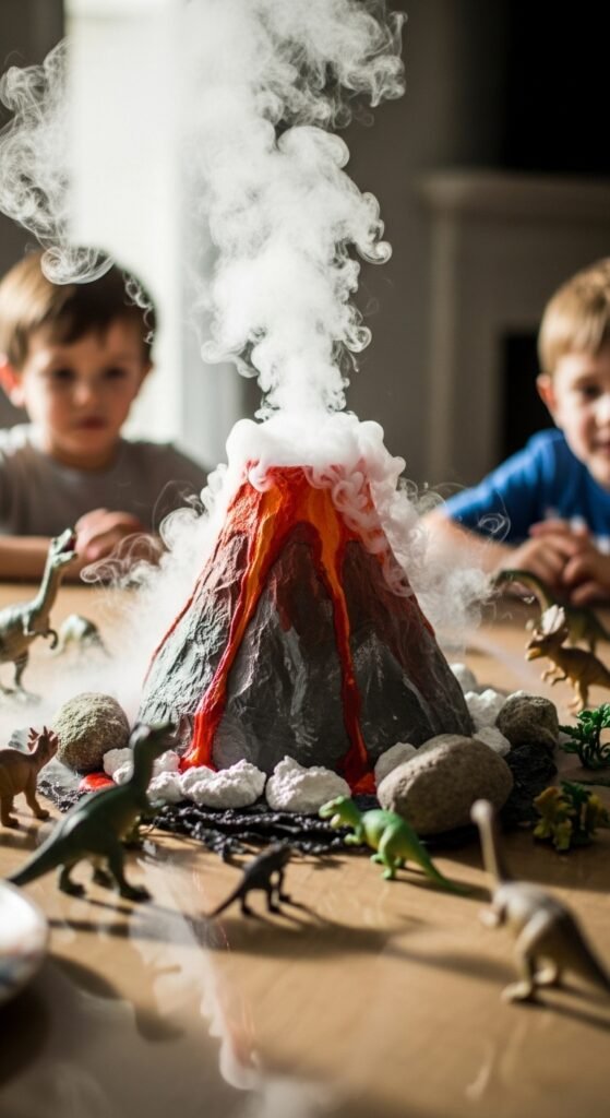 Three simple ingredients can modify an ordinary party table into a prehistoric terrain complete with bubbling, smoking volcanoes that’ll have kids absolutely mesmerized.
