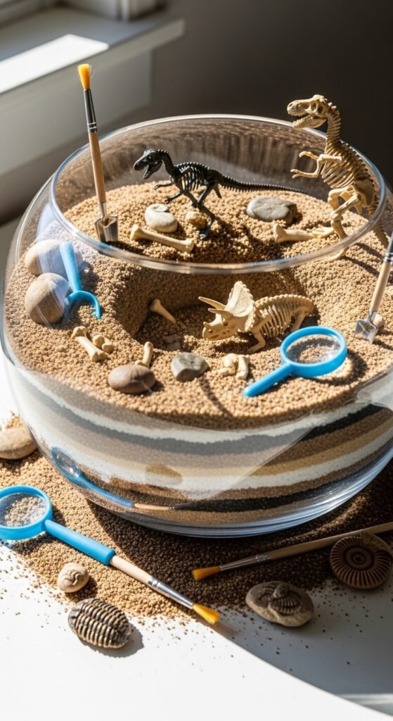 Start with clear glass containers—fish bowls work perfectly. Layer sand, small rocks, and dirt to create realistic excavation sites. Bury plastic dinosaur skeletons partially, leaving bones peeking through the surface.