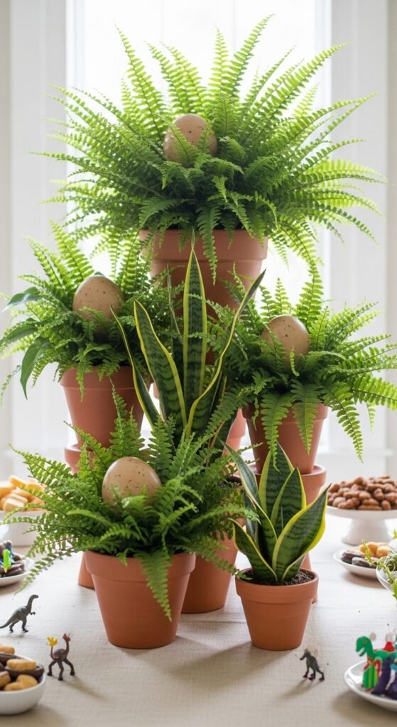 Create stunning prehistoric plant displays using Boston ferns, bird’s nest ferns, and snake plants in terra cotta pots. I’ve found that arranging these lush fern arrangements at varying heights adds incredible depth to your tablescape.